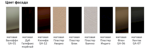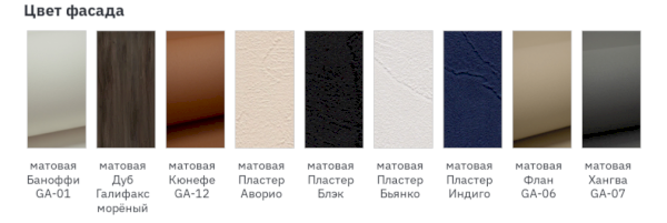 Цвет фасада: матовая Баноффи GA-01, матовая Дуб Галифакс морёный, матовая Кюнефе GA-12, матовая Пластер Аворио, матовая Пластер Блэк, матовая Пластер Бьянко, матовая Пластер Индиго, матовая Флан GA-06, матовая Хангва GA-07.